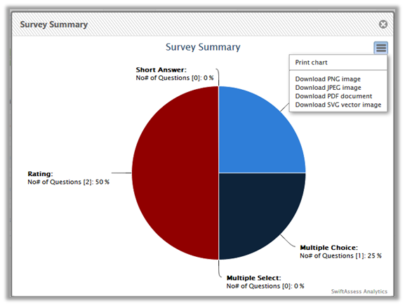 Clicking on in Survey Questions Summary widget shows a pie chart that summarizes the questions by showing their percentages. You can also print the chart and export it as an image (PNG/JPEG), PDF document, or as an SVG vector image.