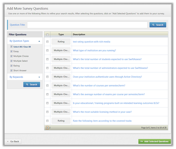 To choose questions to add to an assessment, all questions are displayed in a table in "Add More Survey Questions". To easily find questions, you can search using keywords or use the filter options to minimize the number of questions displayed.