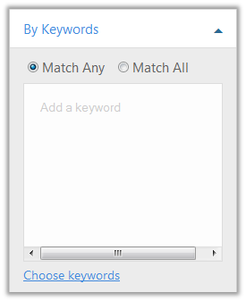 •Search by keywords: 1.Type one or more keywords in the text area. 2.Select "Match Any" if you want the questions that appear to have any of the keywords. Or select "Match All" if you want the questions that appear to have all of the keywords.