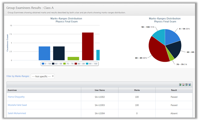 The marks ranges are distributed and represented in two types of charts; pie chart, and bar chart.
